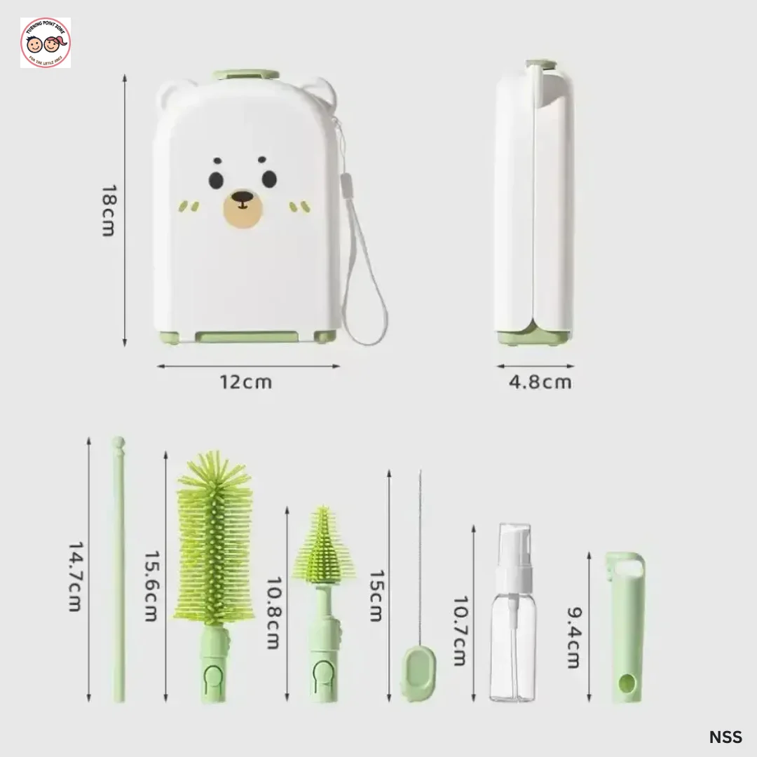 Keep your baby’s feeding essentials perfectly clean and hygienic with our Premium Baby Feeding Bottle Cleaning Brush Set. Designed for busy moms, this all-in-one kit comes in an adorable bear-shaped portable storage case, making it both practical and super cute.